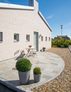 På denna altan med runda former skapar sandstensplattorna en härlig och inbjudande uteplats. Gatstenarna omramar ytan på ett elegant sätt, samtidigt som sjöstenarna ger en öppen och rymlig känsla. En perfekt plats att njuta av i vårsolen eller under varma och sköna sommarkvällar.