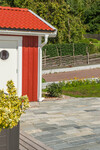Skifferstenlagd uteplats utanför en röd stuga med utsikt över havet. Den härliga uteplatsen med den varmgråa skiffern blir en plats som bjuder in till sociala sammankomster och avkoppling, där du kan njuta av spektakulär havsutsikt.