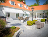 En vacker och inbjudande uteplats med en perfekt stenläggning av granit. Den solida och naturliga ytan ger en känsla av stabilitet och elegans. Stentrappor i granitsten förbinder olika nivåer av uteplatsen som även avgränsas av stödmurar av tumlad mursten.